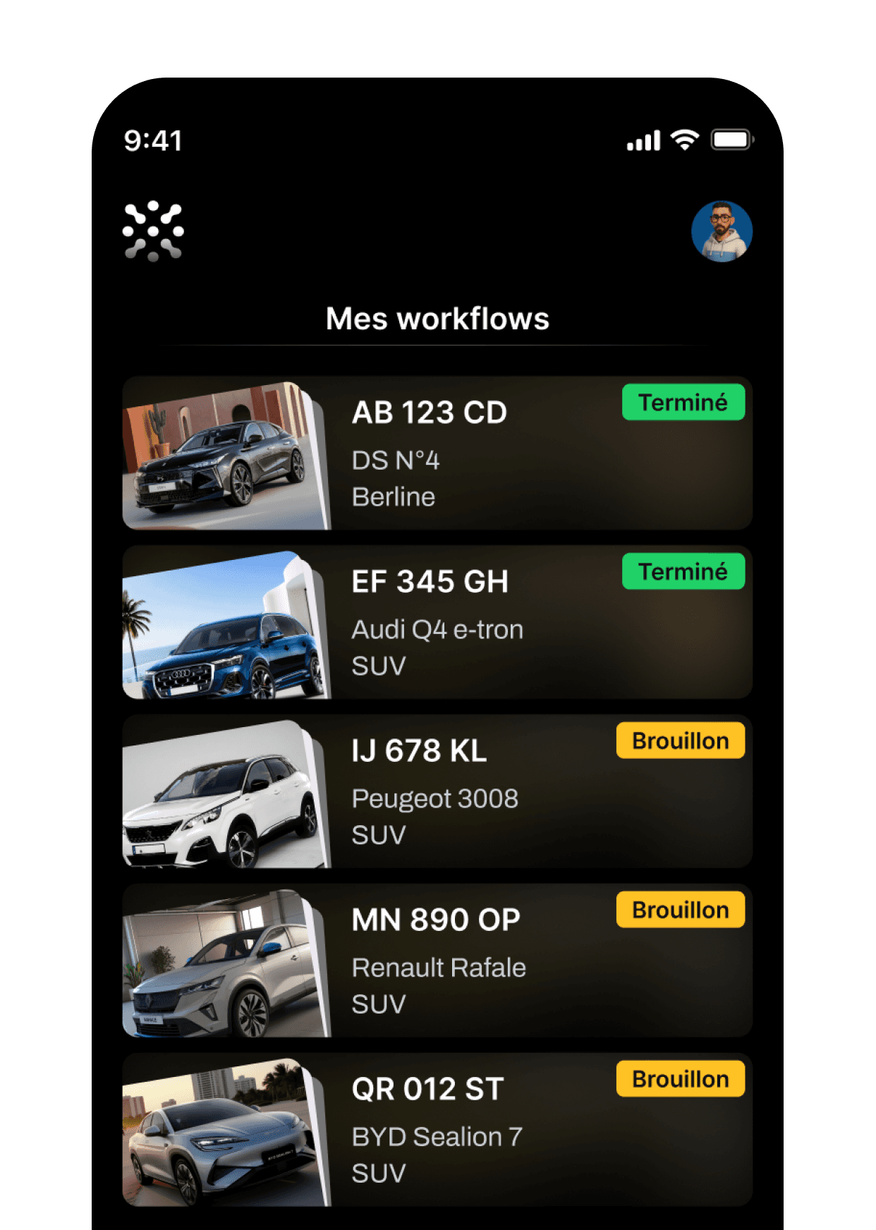 L'app guide votre utilisateur avec un gabarit visuel adapté au type de véhicule : berline, SUV, utilitaire, moto, camping-car.